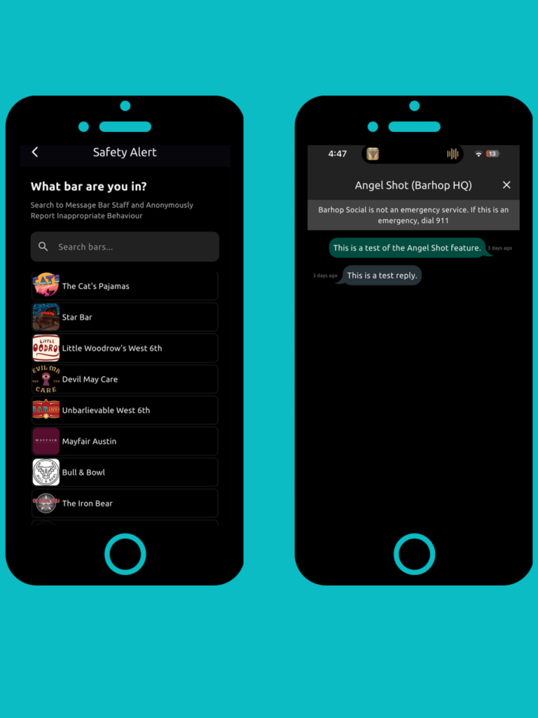 With the Angel Shot feature, anonymously report inappropriate behavior directly to bar staff!